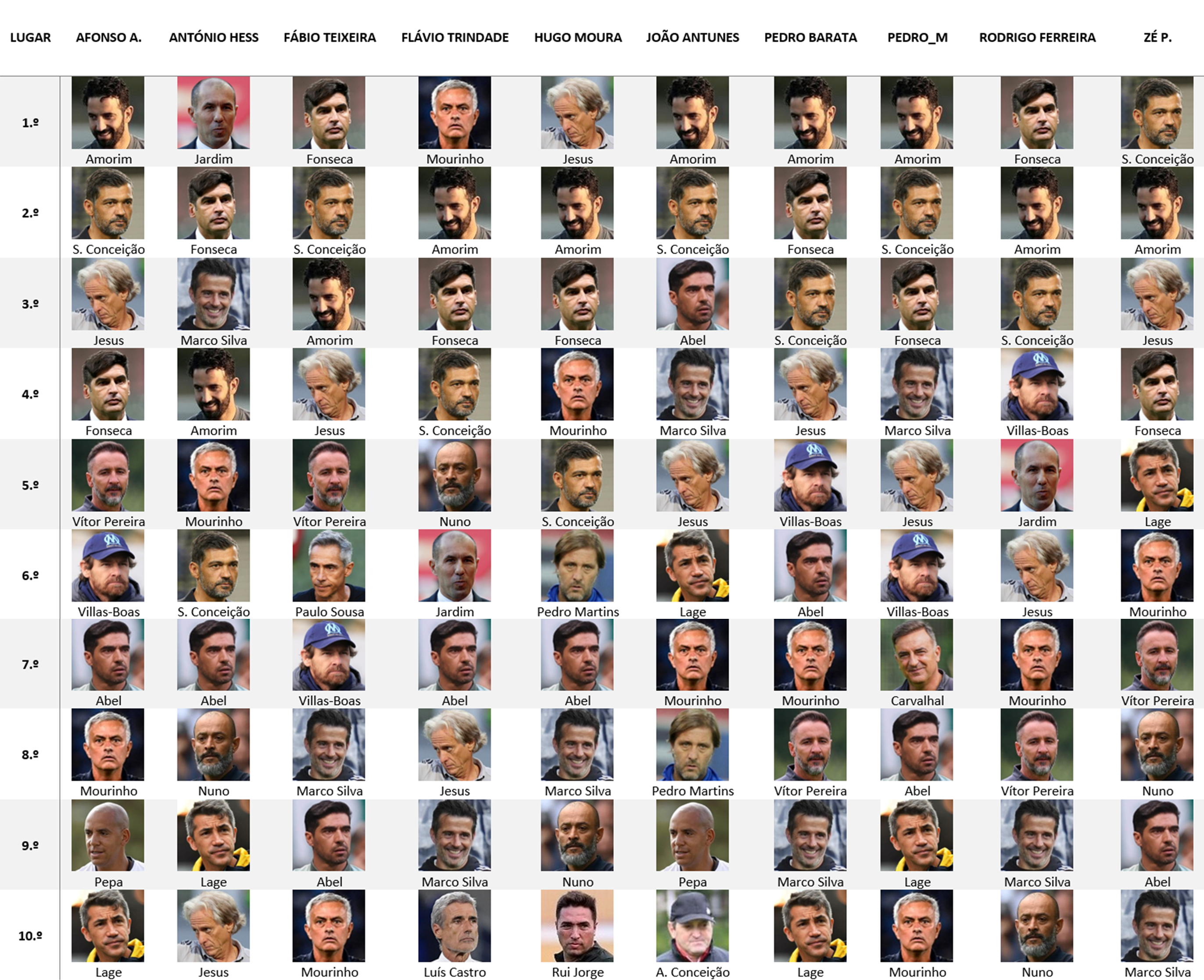 Mas no geral concordo com o top10. Menções honrosas para Bruno Lage, Pedro Martins, NES e Luís Castro. Carvalhal, Ivo Vieira, Pepa e Pedro Caixinha também.