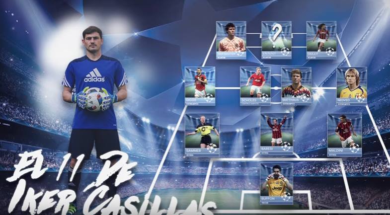 Iker Casillas, sempre muito activo nas redes sociais, publicou um vídeo com aquele que considera ser o melhor XI na história da Liga dos Campeões. O guarda-redes do FC Porto escolheu Buffon para a baliza, já Maldini, Matthias Sammer e Baresi completam o sector defensivo. No meio campo o espanhol nomeou Nedved, Giggs, Scholes e Matthaus. O ataque por sua vez fica entregue a Gullit e Marco Van Basten tendo o espanhol deixado uma vaga em jeito de desafio para os seguidores, questionando qual é o avançado que falta.