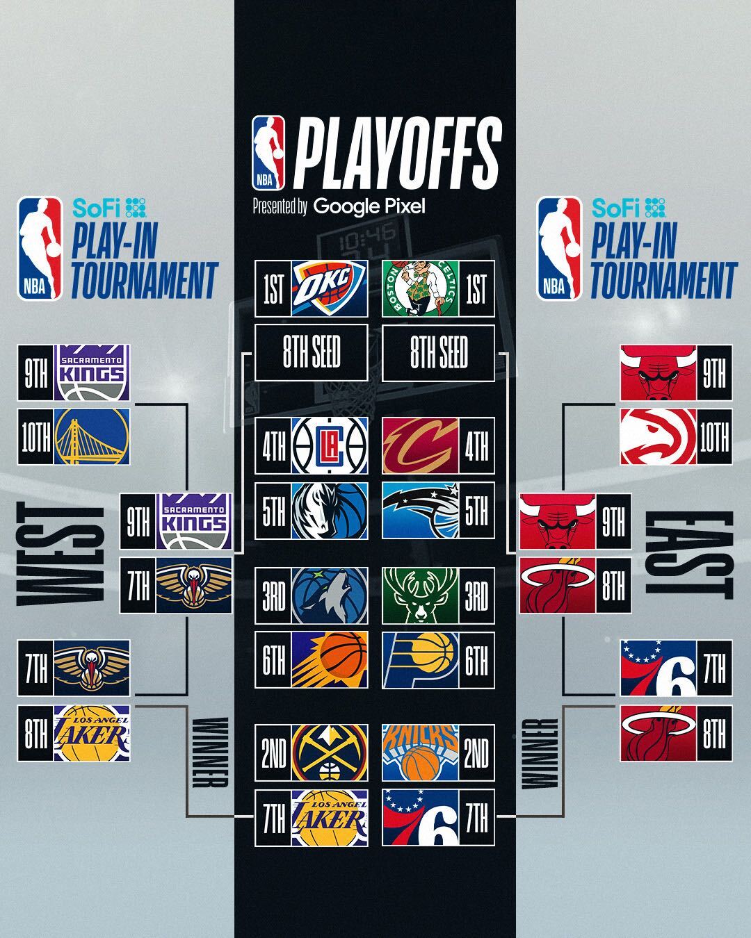 Os 76ers derrotaram os Heat, por 105-104, e marcaram duelo com os Knicks nos playoffs. Philadelphia até esteve muito tempo em desvantagem, no entanto Batum (20 pontos e bloco decisivo no final) fez a diferença. Já Miami, que viu Butler lesionar-se no joelho, terá de discutir a última vaga nos playoffs da Conferência Este frente aos Bulls, que bateram os Hawks, por 131-116. Coby White teve o melhor jogo da carreira (42 pontos), DeRozan (22 pontos e 9 assistências) e Dosunmu também estiveram em destaque.