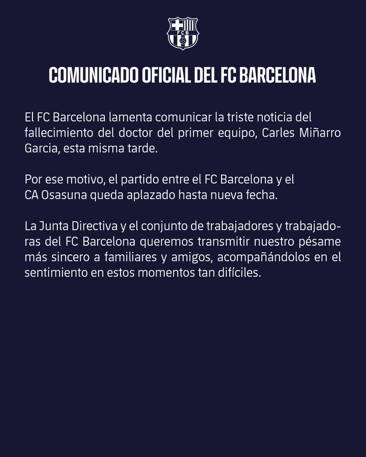 O duelo entre o Barcelona e o Osasuna foi adiado devido à morte do médico da equipa catalã, Carles Miñarro García. As equipas já estavam no Estádio, inclusive já tinham anunciado o 11 inicial do Barça: Szczesny; Kounde, Cubarsí, García, Martín; Casadó, Gavi; Raphinha, Olmo, Yamal; Ferrán.