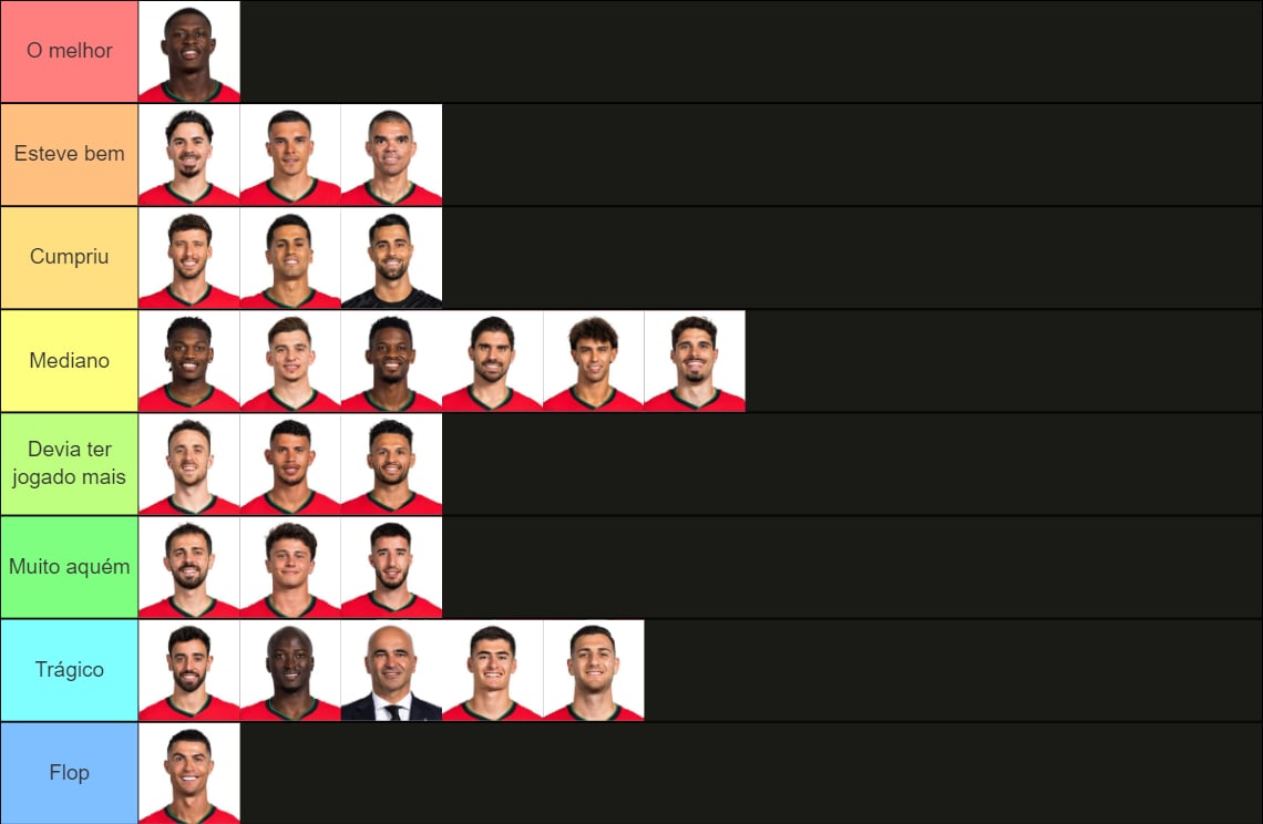 Baixava igualmente o Bernardo para trágico, ele que foi absolutamente ridículo neste Euro, e nesse caso subiria o Danilo para muito aquém, ele que jogou apenas um jogo, no qual esteve mal, tal como toda a equipa aliás.