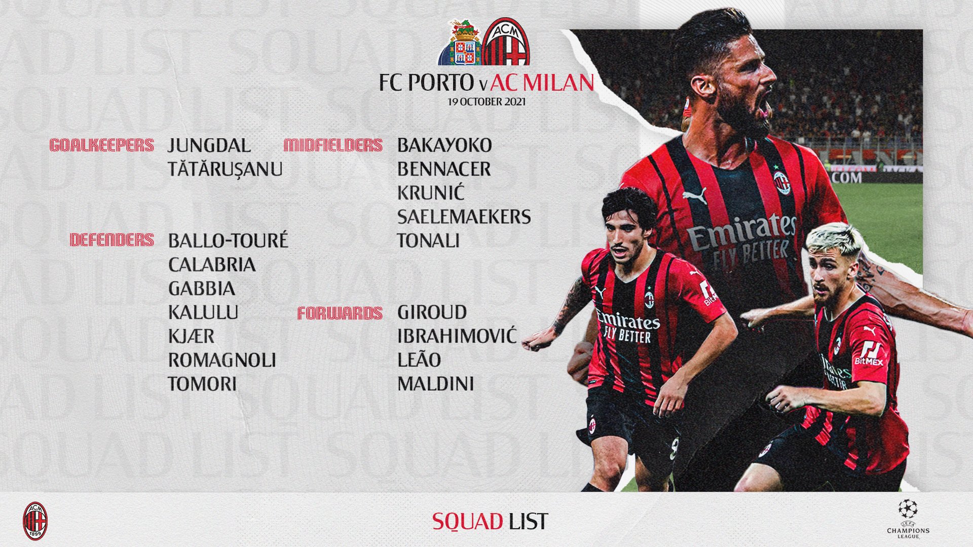 Os guarda-redes Maignan e Plizzari, o lateral Florenzi e os extremo Júnior Messias e Ante Rebić, por lesão, Theo Hernández e Brahim Díaz devido a terem testado positivo à covid-19, e Kessié, expulso diante do Atlético de Madrid, são baixas no AC Milan para o jogo com o FC Porto, referente à 3.ª jornada da Champions. Já Tiemoué Bakayoko recuperou e integra a lista de Pioli, que também conta com Rafael Leão.