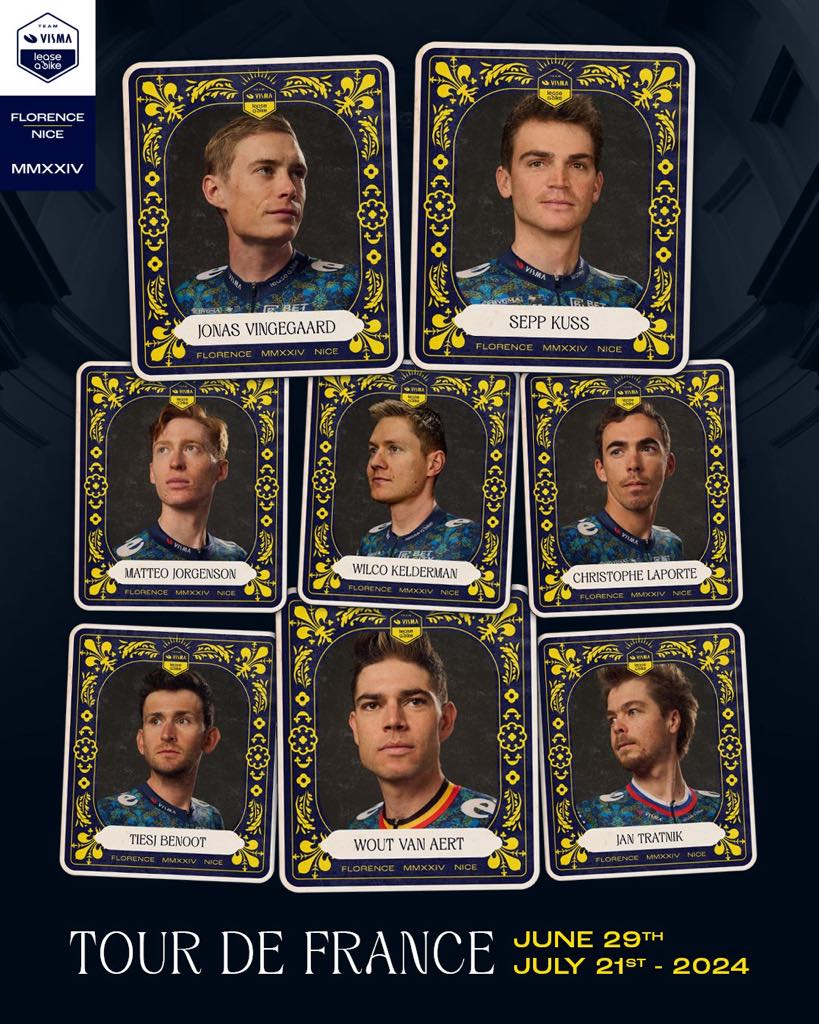 A presença de Wout Van Aert é o grande destaque na equipa da Visma-Lease para o Tour, que terá Jonas Vingegaard, vencedor em 2022 e 2023, como chefe de fila. Sepp Kuss, vencedor da última Vuelta, e o seu compatriota Matteo Jorgenson, assim como o francês Christophe Laporte, o belga Tiesj Benoot, o neerlandês Wilco Kelderman e o esloveno Jan Tratnik, completam o leque escolhido.