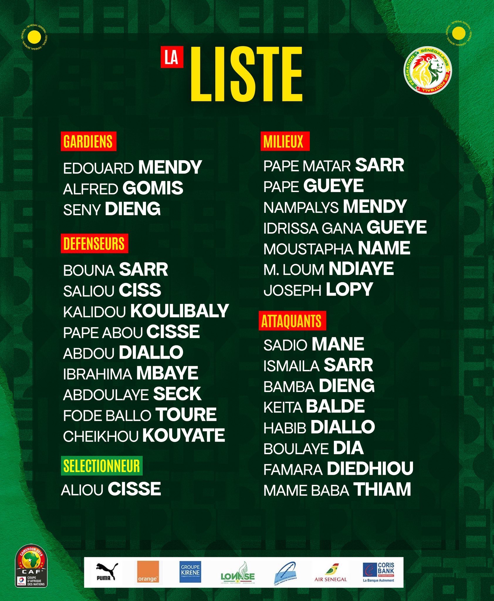 O Senegal, que é um dos principais favoritos juntamente com a Argélia, apresentou a lista para a CAN, com destaque para a presença das estrelas Edouard Mendy, Sadio Mané, Kalidou Koulibay, Gana Gueye ou Ismaila Sarr. Mamadou Loum, que representa o Alavés por empréstimo do FC Porto, está igualmente na lista de Aliou Cissé.