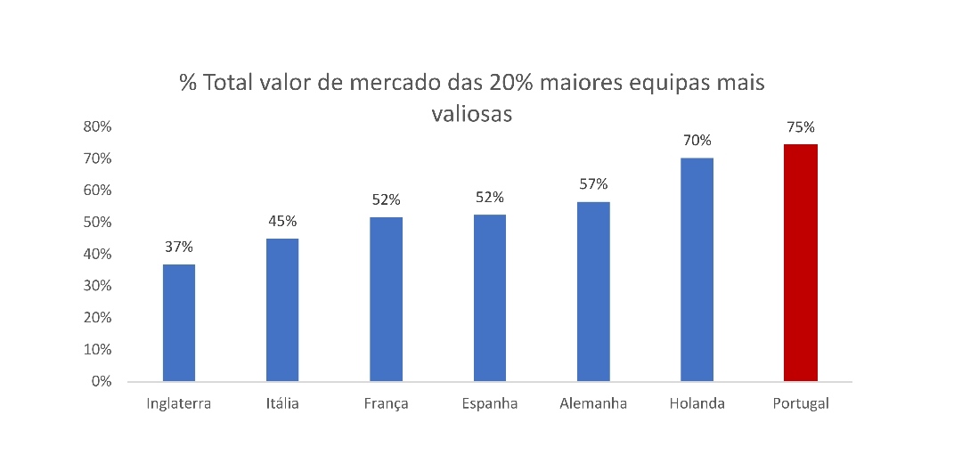 Em primeiro lugar as qualidade do futebol interno: Quando olhamos aos valores de mercado, a liga portuguesa é aquela que maior valor concentra nas 4 primeiras equipas (ordenadas por valor de mercado), sendo a única que ultrapassa claramente o dobro da liga com menor valor concentrado – a Inglesa. É também a 2ª liga em que a diferença entre a equipa mais valiosa e a menos valiosa é mais acentuada – o Benfica possui um valor de mercado equivalente a 31x o valor do Chaves – apenas suplantada pela Liga Francesa, tão criticada pela aparição do PSG que tem um valor de mercado 36x maior que o Ajaccio. Já na liga inglesa esta diferença é de apenas 6x.