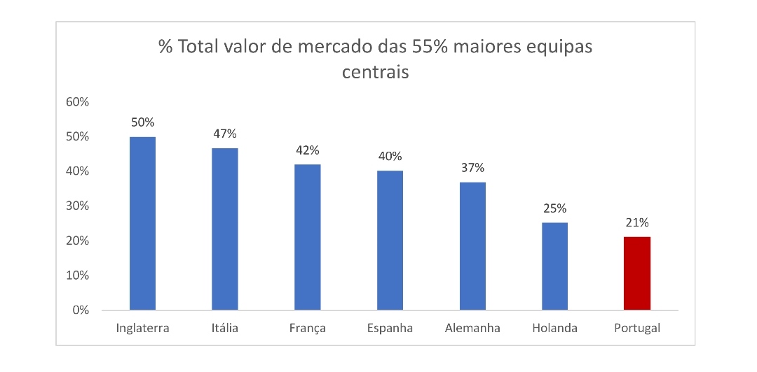 Por último, podíamos ainda argumentar que “apesar da concentração de valores de mercado nas maiores equipas, isto deve-se à existência de um conjunto de equipas muito pequenas no final, sendo que as equipas no meio são equilibradas”. Na verdade este argumento também não se confirma. Olhando para as 9 equipas que compõe o centro da ordenação por valores de mercado, a Liga Portuguesa é aquela que menos valor concentra. Olhando par estes números é possível entender que, existindo diferenças tão elevadas nos recursos entre clubes, seja difícil manter a qualidade do jogo, uma vez que, as equipas “mais fracas” necessitam utilizar táticas menos elegantes para conseguirem pontuar e que, mesmo nos jogos entre elas, o futebol seja pouco atrativo dada a menor capacidade dos intervenientes (acreditando que os valores de mercado relativos, ou seja ajustados à realidade de cada país, correlacionam positivamente com a qualidade dos futebolistas).