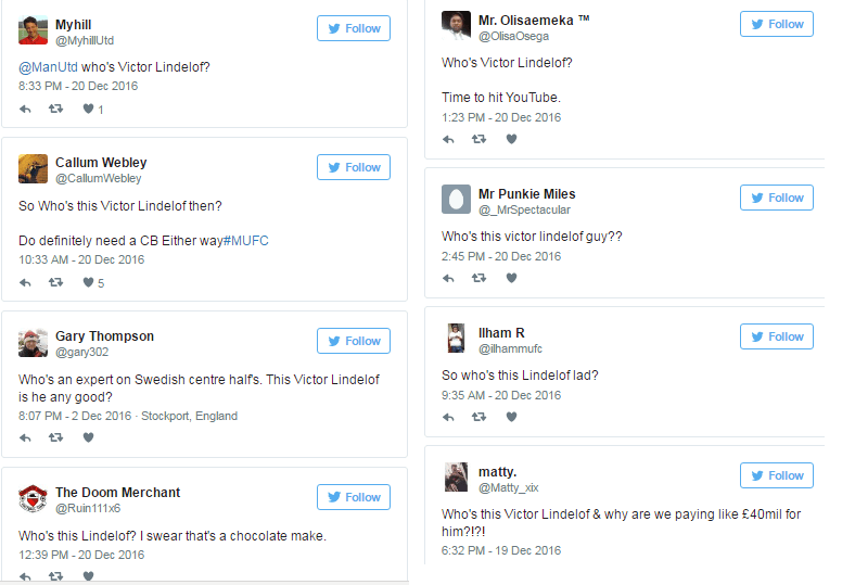 Victor Lindelöf deve deixar o Benfica para rumar ao Man Utd, numa transferência, na ordem dos 45 milhões de euros, que irá permitir ao sueco entrar no Top 5 dos defesas mais caros na história do futebol, mas por incrível que pareça a maior parte dos adeptos do clube que o vai receber nem o conhece. Hoje nos sites/jornais ingleses os comentários foram quase todos de espanto e a questionar quem é Lindelof. O 101greatgoals, que destaca que o Man Utd vai pagar um valor estratosférico por um jogador que tem menos de 30 jogos ao mais alto nível, fez um apanhado desse tipo de testemunhos.