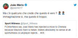 João Mário teve de recorrer ao Twitter para abordar um rumor de mercado, que sugeria que teria rejeitado uma mudança para o Chelsea pelo simples facto de Maurizio Sarri ser italiano. “Mas alguém acredita que isto é verdade? Imaginação, sim, mas isto é demais”, escreveu o médio do Inter naquela rede social.