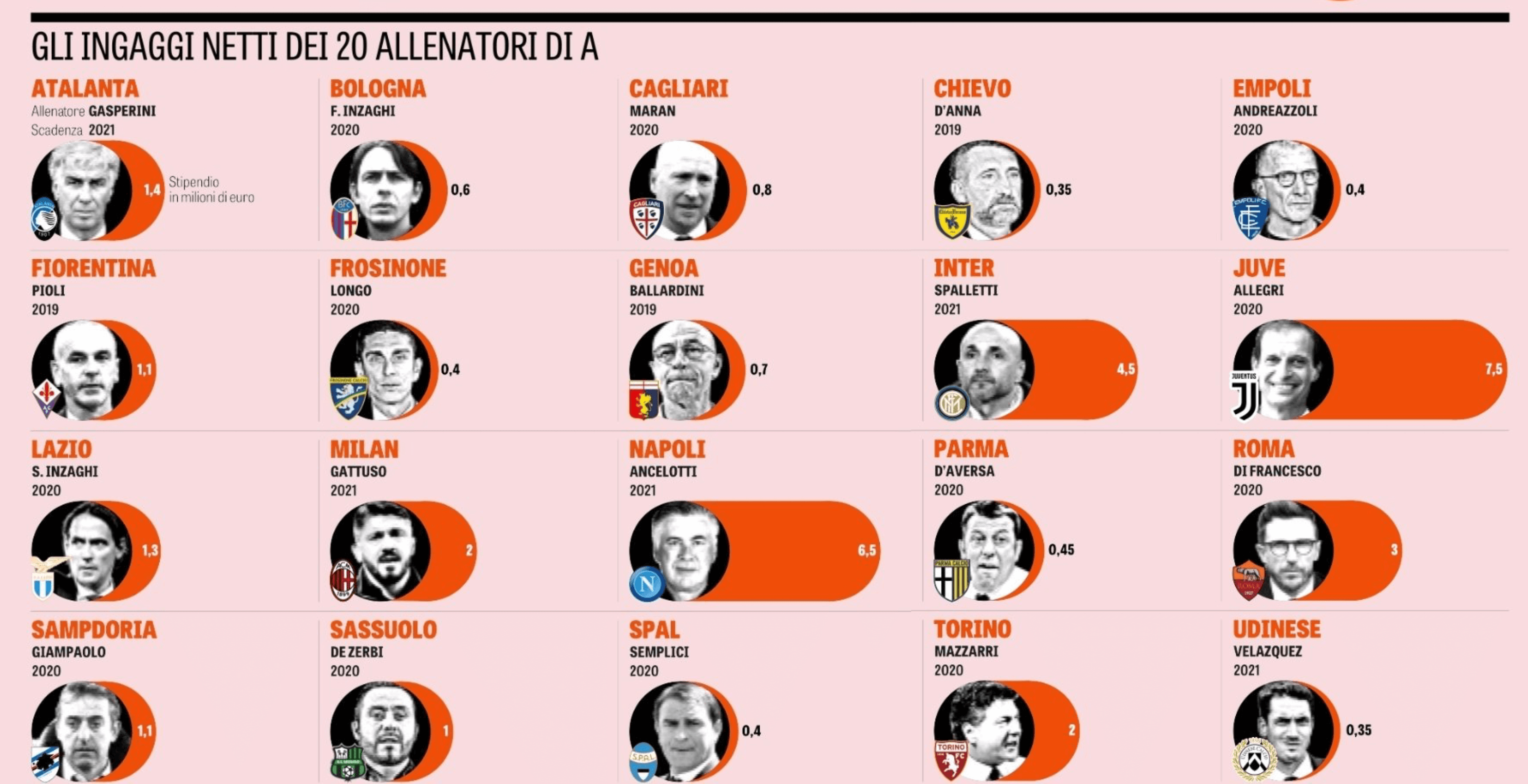 A Gazetta dello Sport revelou também os salários anuais dos 20 treinadores dos emblemas que milita na Série A. Sem surpresa, Max Allegri, que aufere 7,5 milhões de euros, é o técnico mais bem pago do campeonato, seguindo-se Ancelotti (com 6,5) e Spalletti (4,5). Já Di Francesco (3), e Gattuso e Mazzarri (2 cada um) completam o top-6. De realçar ainda os 1,3 ME que ganha Simone Inzaghi, que tem feito um grande trabalho com a Lazio.