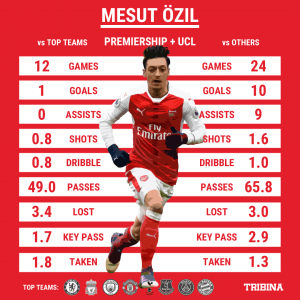 Por outro lado analizando as Stats do Ozil? Serão elas culpa do jogador? Ou será da forma como o Arsenal aborda os jogos com equipas de topo. Contra equipas menores em que o Arsenal por norma tem Bola, em que o Ozil joga mais proximo das áreas de definição o seu jogo é potencial, contra equipas de topo onde o Arsenal estica mais o jogo, é normal que o Ozil tenha mais dificuldades. Joga 15 20m mais longe da zona onde o seu jogo melhor se encaixa.