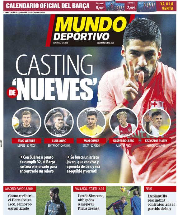 O Barcelona não deixa de pensar no futuro, e uma das prioridades para o curto-médio prazo é encontrar um avançado que possa substituir Luís Suárez. É que o uruguaio completa 32 anos já em Janeiro e com a saída de Paco Alcácer ficou sem uma alternativa clara no elenco. Neste sentido, segundo o Mundo Deportivo, os catalães têm em mira Kasper Dolberg (Ajax), Timo Werner (RB Leipzig), Piatek (Génova), Luka Jovic (que está no Eintracht de Frankfurt por empréstimo do Benfica), Nicolas Pepé (Lille), Maxi Gómez (Celta de Vigo) e André Silva (internacional português que está no Sevilla por empréstimo do AC Milan). A publicação acrescenta que a ideia é contratar um ponta-de-lança jovem e com golo.