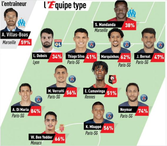 Vê-se logo que é um XI feito pelos adeptos, tudo jogadores do PSG. Percebe-se que o PSG tenha mais jogadores, não é por acaso que estão em primeiro com tantos pontos de avanço, mas houveram tantos outros destaques, principalmente na defesa! Para mim o melhor XI foi: Larsounner, Hamari Traoré, Thiago Silva, Abdelhamid, Kamara, Camavinga, Verratti, Di Maria, Neymar, Mbappé e Ben Yedder.