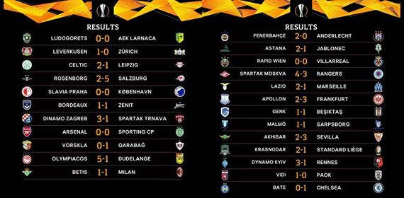 O Arsenal, Chelsea, Frankfurt, Dínamo Zagreb, Lazio, Leverkusen e Zurique já garantiram a passagem para os 16 avos final da Liga Europa. Recorde-se que o Sporting ‘só’ precisa de uma vitória para ficar pelo menos em segundo lugar no grupo. RB Salzburg, Astana e D. Kiev também estão bem encaminhadas, já o Marselha, Anderlecht e Ludogorets ficaram pelo caminho.