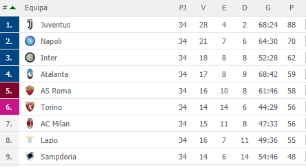 Na jornada 34 da Serie A, a Atalanta bateu a Udinese por 2-0 e subiu ao 4.º lugar, num encontro onde a formação de Bergamo dominou muito, mas só conseguiu chegar ao golo da marca de grande penalidade e depois de Rodrigo de Paul assustar o estádio Atleti Azzurri D’Italia com um remate ao poste. Masiello foi carregado na área numa incursão ao ataque e De Roon abriu o activo aos 81 minutos. Quatro minutos depois Pasalic, assistido por Zapata, fez o 2-0, beneficiando ainda de um ressalto num defesa da Udinese, que traiu Musso. O guardião dos visitantes negou ainda o 3-0 a Zapata, após o colombiano se livrar de três defesas contrários. Com este resultado, a Atalanta regressa ao top-4, com 59 pontos, mais um do que a Roma e mais dois que Torino e AC Milan. Já a Udinese continua em zona perigosa, com apenas quatro pontos de vantagem sobre a zona de despromoção.