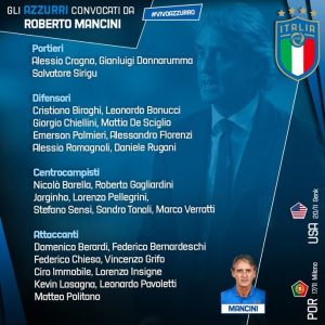 Avançados: Berardi (Sassuolo), Bernardeschi (Juventus), Federico Chiesa (Fiorentina), Vincenzo Grifo (Hoffenheim), Immobile (Lazio), Insigne (Napoli), Kevin Lasagna (Udinese), Leonardo Pavoletti (Cagliari), Matteo Politano (Inter).