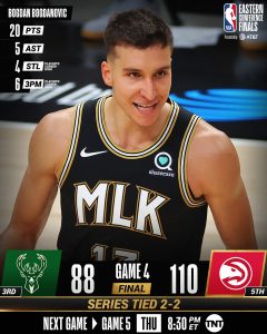 Os Hawks, mesmo sem o lesionado Trae Young, bateram os Bucks por 110-88 e empataram a final do Este (2-2). Atlanta realizou uma grande 1.ª parte, e no 3.º período, quando vencia por 10, deu-se o momento do encontro, com a lesão de Giannis, que torceu o joelho, e não conseguiu voltar à partida. Aproveitou a equipa da casa que rapidamente colocou a vantagem nos 20 pontos e depois ainda a foi aumentando. Lou Williams, que foi titular no lugar de Trae, apontou 21 pontos, Bodganovic chegou aos 20, enquanto Capela e Kuerter marcaram 15 cada um. Na equipa de Milwaukee, Holiday foi o melhor marcador, com 19 pontos.
