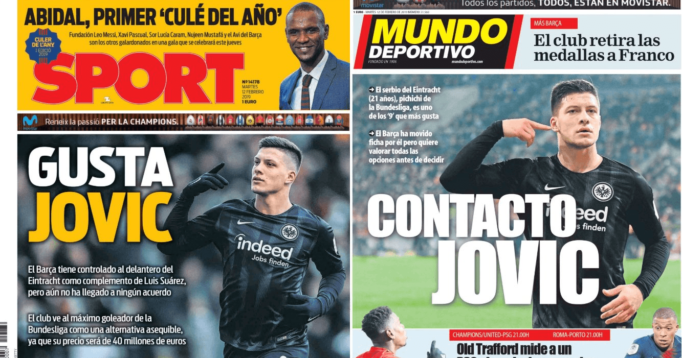 Na Alemanha garantem que o Barcelona tem um acordo com o Eintracht Frankfurt por Luka Jovic, que já marcou 19 golos em 27 jogos esta época. E na Catalunha os jornais, apesar de não darem o negócio como fechado, também adiantam que o jovem, de 21 anos, que é o actual melhor marcador da Bundesliga, está controlado pelo Barça, sendo que a transferência pode chegar aos 40 milhões de euros. Recorde-se que o Eintracht tem uma opção de compra avaliada em 12 milhões para garantir o jogador emprestado pelo Benfica.
