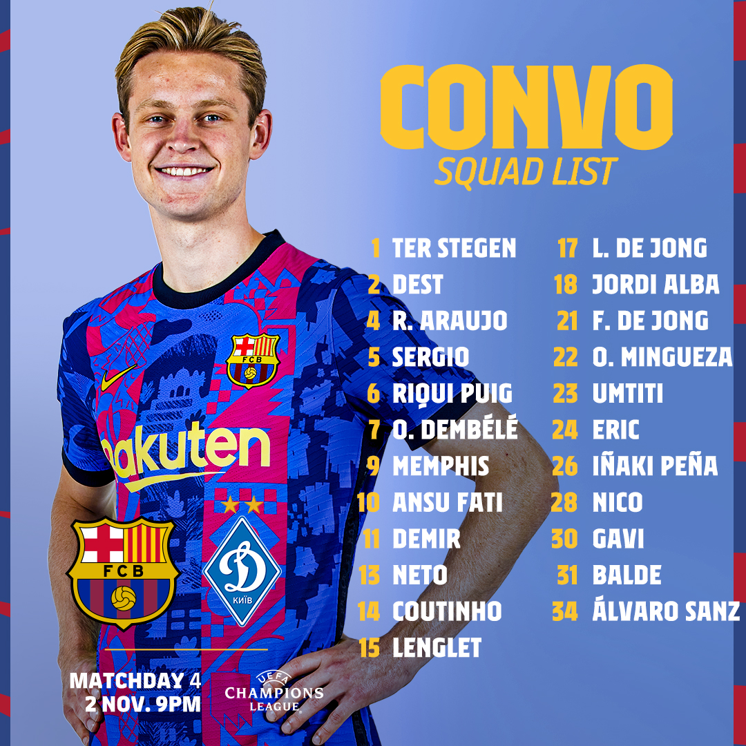 Ousmane Dembélé, que não joga pelo Barcelona desde Maio, integra a convocatória para o jogo com o D. Kiev, para a 4.ª jornada da Champions. Ansu Fati, Frenkie de Jong e Ronald Araujo também estão nos convocados de Sergi. Já Piqué é baixa por lesão.