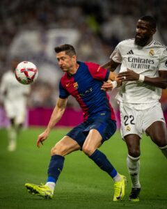 O Barcelona aumentou a liderança na La Liga ao golear o Real Madrid no Bernabéu, por 4-0. Depois de uma 1.ª parte com poucos lances, os blaugrana vieram melhor no 2.º tempo e chegaram à vantagem com Lewandowski a marcar aos 54′ e 56′ minutos. O 2-0 permitiu ao Barça ter ainda mais espaço para as transições e, já depois de Robert Lewandowski ter acertado no ferro, Yamal, com um tiraço, ampliou, sendo que aos 85′ Raphinha, que tinha assistido no 3-0, também fez o seu (grande chapelada) confirmando assim a humilhação.