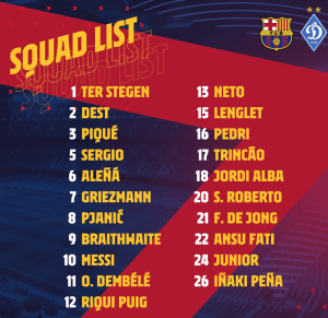 Em casa contra o Dynamo Kiev apenas com 13 jogadores disponíveis deveria ser para rodar a equipa: apostaria em Neto, Dest, Piqué, Lenglet, Firpo, Busquets, Pjanic, Trincão, Griezmann, Fati e Braithwaite.