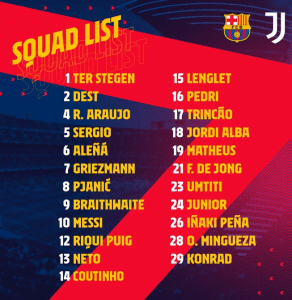 A chamada de Umtiti, que não joga desde 27 de Junho, é o principal destaque na convocatória do Barcelona para a recepção à Juventus. Messi, que falhou os últimos 2 jogos para a Champions, também está na lista. Trincão integra igualmente os convocados de Koeman. Já Dembélé é baixa por lesão.