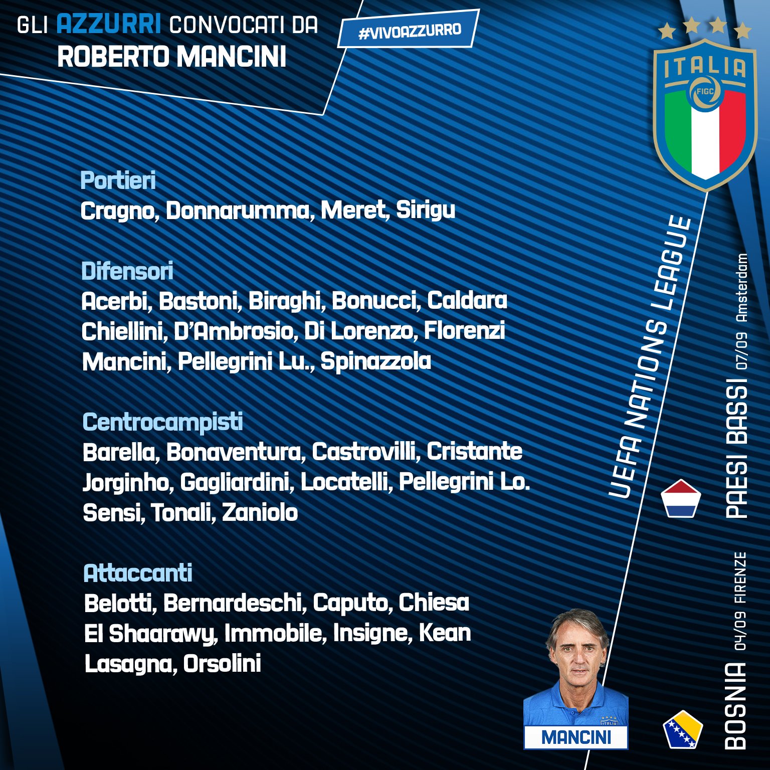 Alessandro Bastoni, Manuel Locatelli e Francesco Caputo são as principais novidades na convocatória de Itália para os jogos com a Bósnia e Holanda, referentes à Liga das Nações. Já Chiellini está de regresso, enquanto Verratti (provavelmente para cumprir um período de férias) e Romagnoli são as principais ausências.
