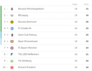Bávaros vão pagar pelas experiências no banco (seguem com o 4.º treinador diferente nos últimos 2 anos e é provável que se siga um 5.º a breve trecho)? Hans-Dieter Flick até vinha acumulando vitórias (4 nos primeiros jogos enquanto técnico principal), mas soma agora 2 derrotas consecutivas e vê a sua equipa ficar a 7 pontos da liderança, ocupada precisamente pelo Mönchengladbach, e a 6 do melhor Leipzig da temporada (a turma de Julian Nagelsmann marcou 22 golos nas derradeiras 5 partidas na Bundesliga, tendo mesmo vencido esses confrontos). Já o Borussia Dortmund cumpriu, e apesar do registo periclitante no campeonato (menos 10 pontos que em igual período da época passada) regressa ao pódio.