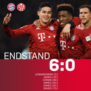 Bávaros não se deixam afectar pela eliminação da Champions e seguram a liderança da Bundesliga, com nova demonstração de força (ao invés do Dortmund, que nos últimos jogos tem sofrido para levar os 3 pontos). Naquela que foi a 3.ª goleada consecutiva na Liga (17 golos neste espaço de tempo), James destacou-se, com um hat-trick, tendo ainda Alphonso Davies, jovem canadiano de 18 anos, tido a oportunidade de se estrear a marcar.