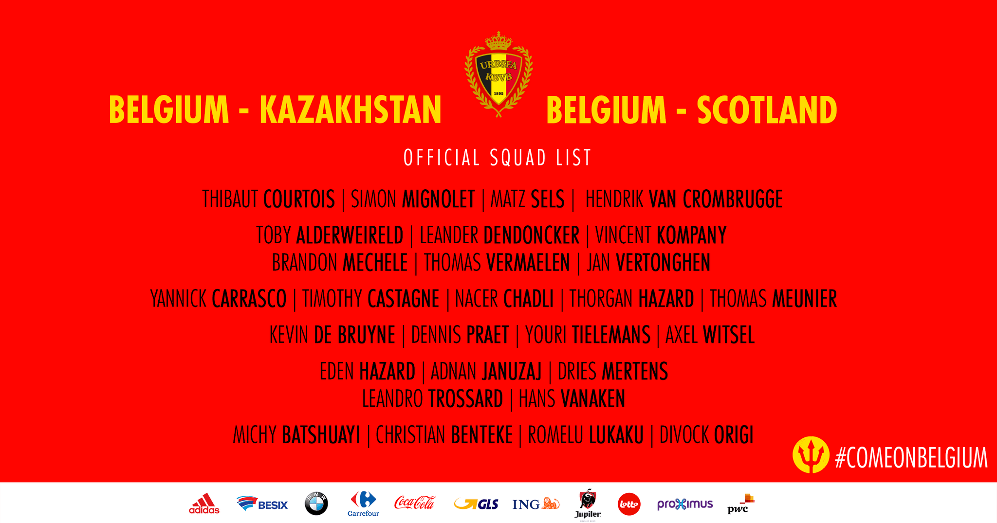 Bom elenco desta Bélgica, como vem sendo hábito na última década! Ainda assim, faz-me alguma confusão ver elementos como Januzaj ou Benteke nesta convocatória! Os últimos tempos tem sido penosos para estes jogadores, logo mais valia dar oportunidade a outros… e há alternativas para tal! O próprio Chadli não merece a chamada se olharmos somente ao rendimento desportivo que teve esta época.