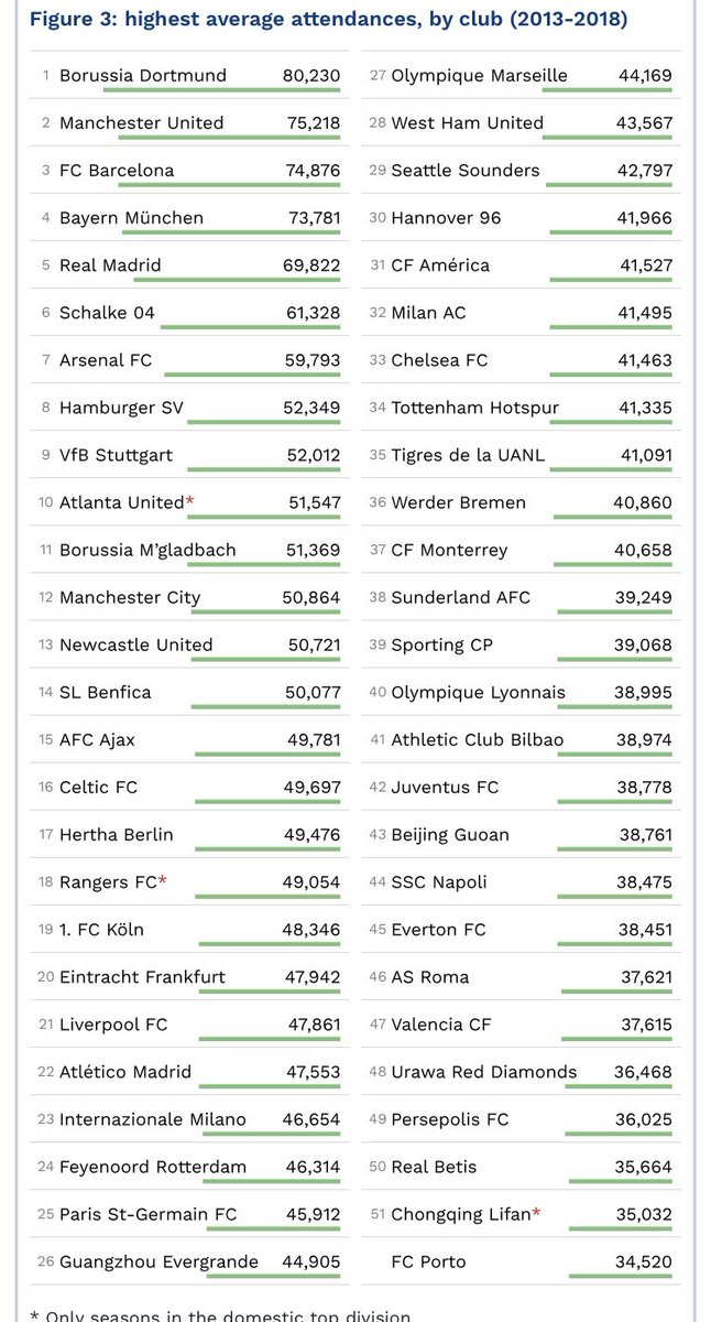 Este estudo é interessante mas os resultados são directamente proporcionais à lotação dos estádios, como seria de esperar. Uma classificação ordenada por percentagem de ocupação de cada estádio era um indicador mais correcto. Fiquei muito surpreendido por ver o Atlanta United em 10º mas confesso que não acompanho a MLS.