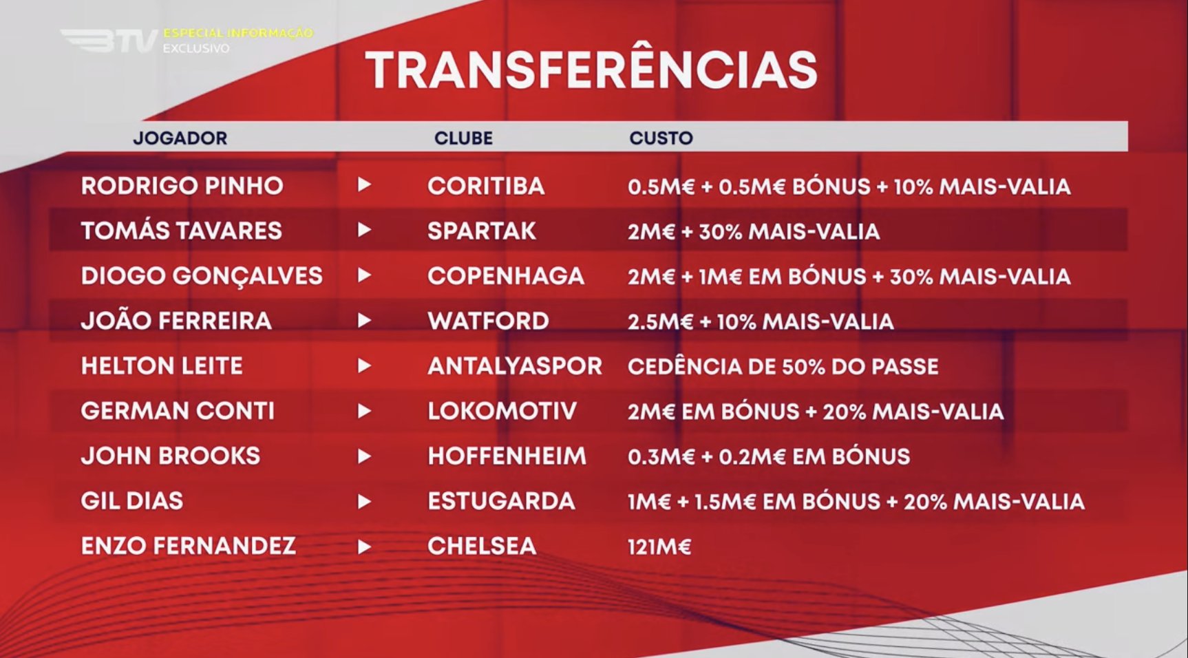 O Benfica detalhou todos os encaixes que realizou com a venda de jogadores em Janeiro. Enzo foi a transferência mais sonante por 121 milhões de euros, já Tomás Tavares (Lokomotiv) e Diogo Gonçalves (Copenhaga) renderam 2 milhões de euros cada, sendo que o valor ainda poderá aumentar. Já Gil Dias saiu para o Estugarda a troco de 1 ME, enquanto João Ferreira (Watford) permitiu um encaixe de 2,5 milhões. Rodrigo Pinho é que para já permitiu um encaixe de apenas 500 mil euros (um valor bem distante do que se falou).