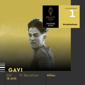 Gavi venceu o Troféu Kopa, prémio da Bola de Ouro referente ao melhor jovem sub-21 da última temporada. O médio do Barcelona sucede ao seu compatriota Pedri, superando a concorrência de Camavinga, Musiala, Bellingham, Nuno Mendes, Gravenberch, Gvardiol, Saka, Adeyemi e Wirtz. O português ficou na 5.ª posição.