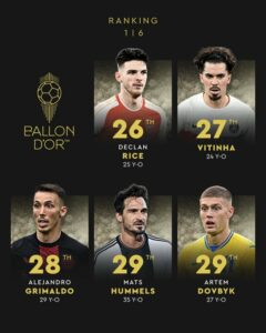 Os dois portugueses nomeados para a Bola de Ouro’2024 ficaram fora do Top 20. Rúben Dias, central do Man City, foi o melhor colocado em 23.º, por exemplo à frente de Palmer, já Vitinha ficou em 27.º. Destaque ainda para o ex-Benfica Grimaldo que figurou no 28.º lugar.