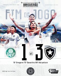 O Botafogo voltou a assumir a liderança do Brasileirão ao vencer no terreno do Palmeiras, por 3-1. Gregore, Savarino e Adryelson apontaram os golos da turma de Artur Jorge, enquanto o Verdão só conseguiu reduzir nos descontos por Rios. O Fogão fica assim com mais 3 pontos que a equipa de Abel quando faltam apenas duas jornadas.