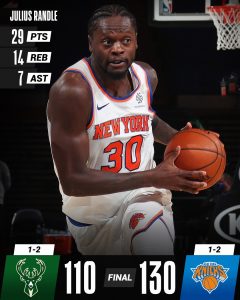 Noite de surpresas na NBA! Depois dos Mavs terem derrotado os Clippers por mais de 50 pontos, foi a vez dos Knicks surpreenderem ao vencerem os Bucks por 130-110. Julius Randle foi a figura da partida com 29 pontos, 14 ressaltos e 7 assistências. Também os Nets surpreenderam pela negativa ao perderem contra os Hornets, por 104-106. Durant apontou 29 pontos, mas falhou a hipótese de levar o jogo para prolongamento. Quem continua melhor do que se perspectivava são os Cavs, que aproveitaram a ausência de Embiid para derrotarem os 76ers por 118-94. Destaque ainda para o triunfo dos Warriors frente aos Bulls por 129-128. Curry marcou 36 pontos, mas foi Lee a decidir com um triplo perto do fim.