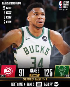 Os Bucks empataram a final do Este (1-1) ao esmagarem os Hawks por 125-91. Milwaukee ao intervalo já tinham uma vantagem de 32 pontos e na 2.ª parte passaram mesmo os 40 pontos de diferença. Giannis marcou 25 pontos em 29 minutos, Holiday chegou aos 22, num jogo que deu para dar minutos a todos os suplentes. Na equipa de Atlanta, Young desta vez não passou dos 15.