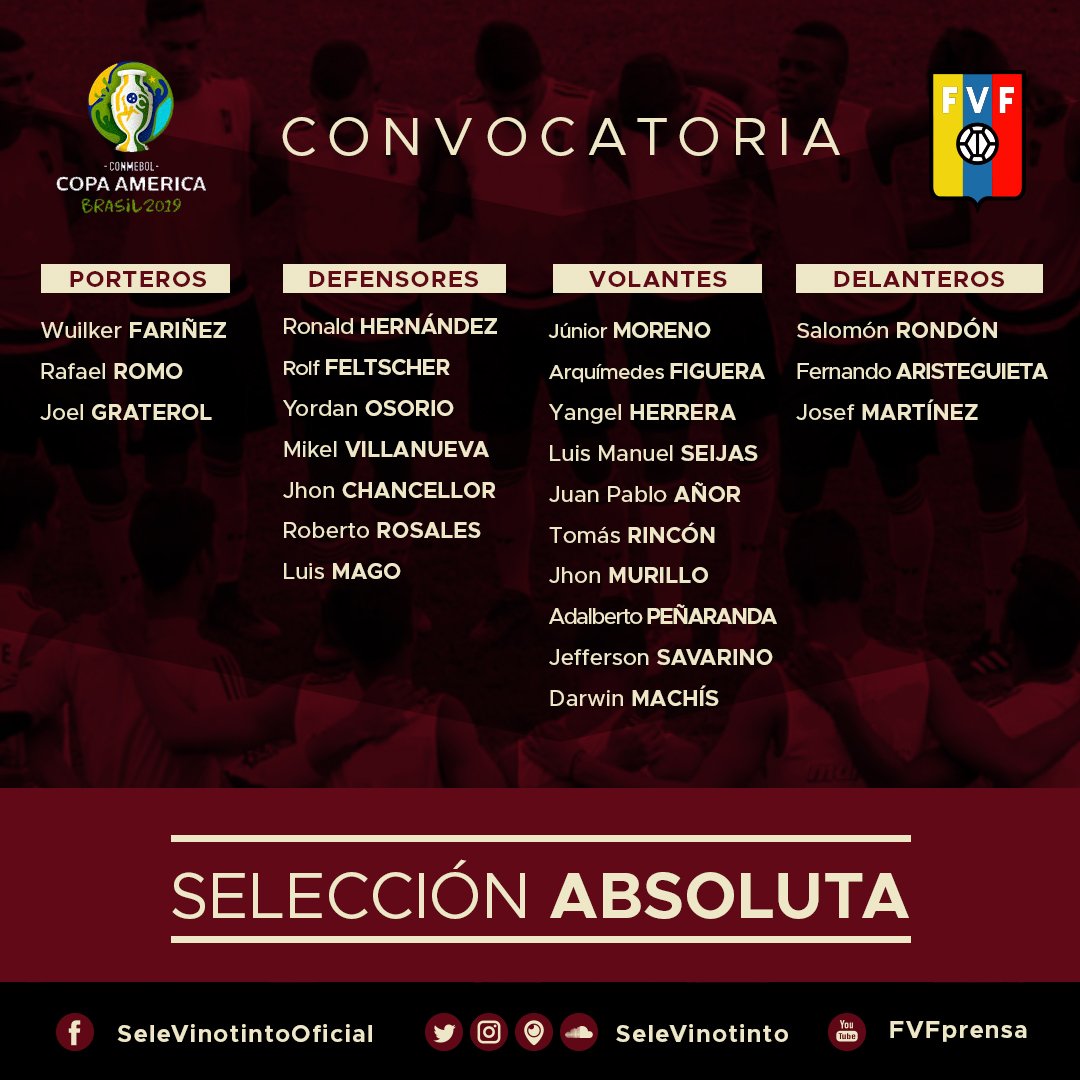 Osorio (Vit. Guimarães) e Jhon Murillo (Tondela) integram a lista final da Venezuela para a Copa América. Já Jhonder Cádiz, que está quase certo no Benfica, ficou fora dos convocados de Rafael Dudamel. Recorde-se que os Vinotinto integram o grupo A, com Brasil, Bolívia e Peru.