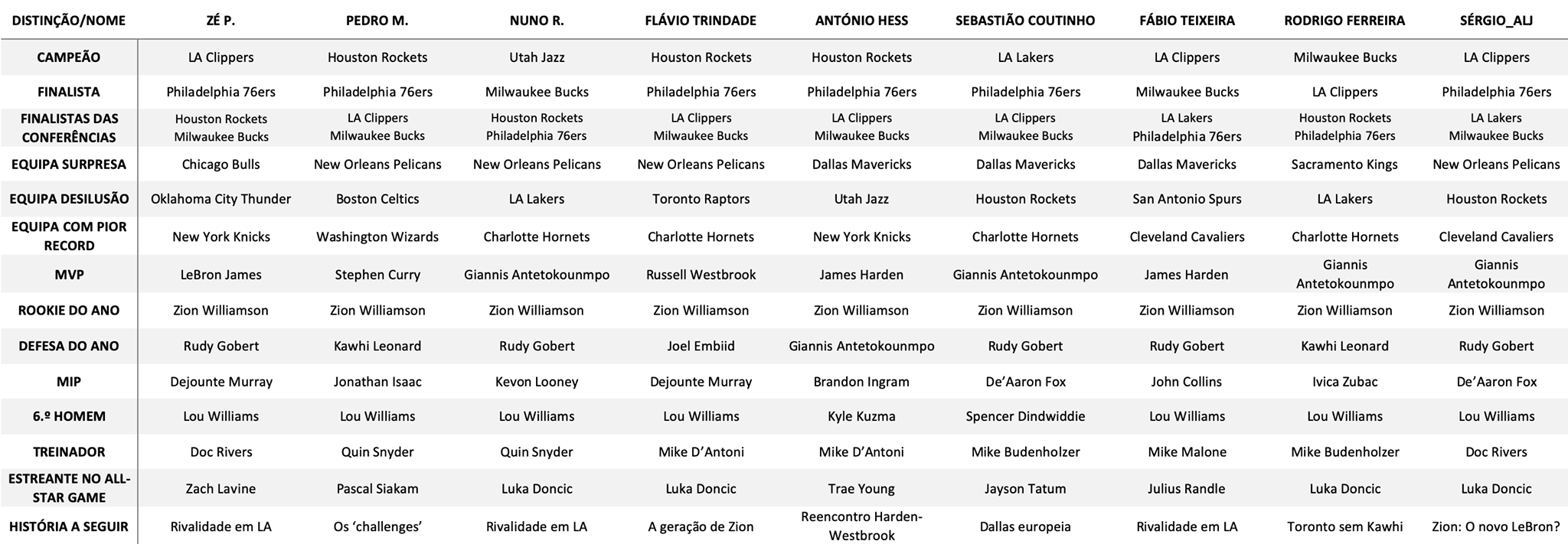 Clippers para mim sao os favoritos a ganhar. Melhor two way team da era moderna, Doc sabe como ganhar aneis, Kawhi em modo cyborg é o melhor jogador da NBA (KD nao vai jogar este ano) mas acima de tudo tem que afastar as lesoes.