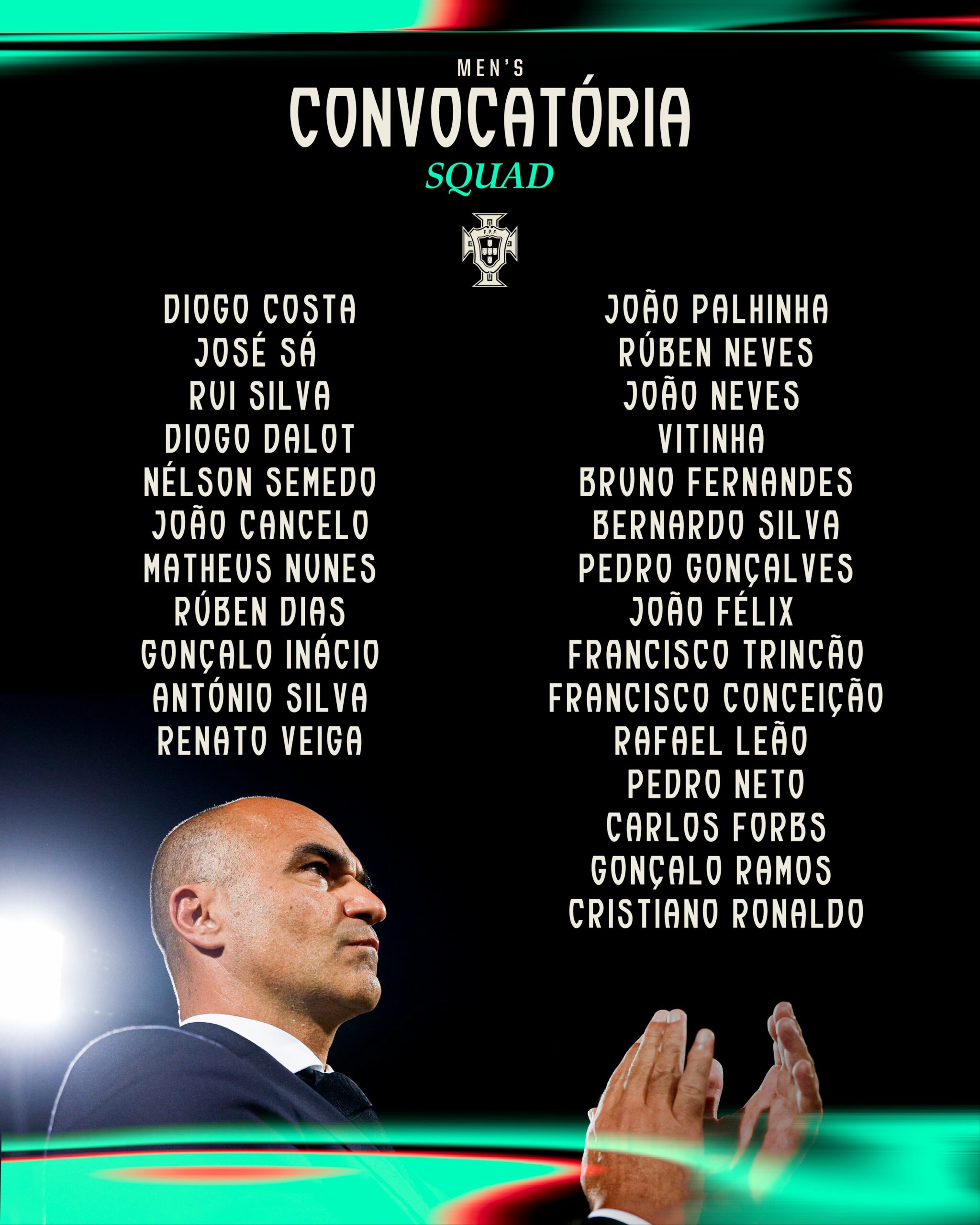 Avançados – Pedro Gonçalves (Sporting CP), João Félix (Al Nassr), Francisco Trincão (Sporting CP), Francisco Conceição (Juventus), Rafael Leão (AC Milan), Pedro Neto (Chelsea), Carlos Forbs (Club Brugge), Gonçalo Ramos (PSG) e Cristiano Ronaldo (Al Nassr).