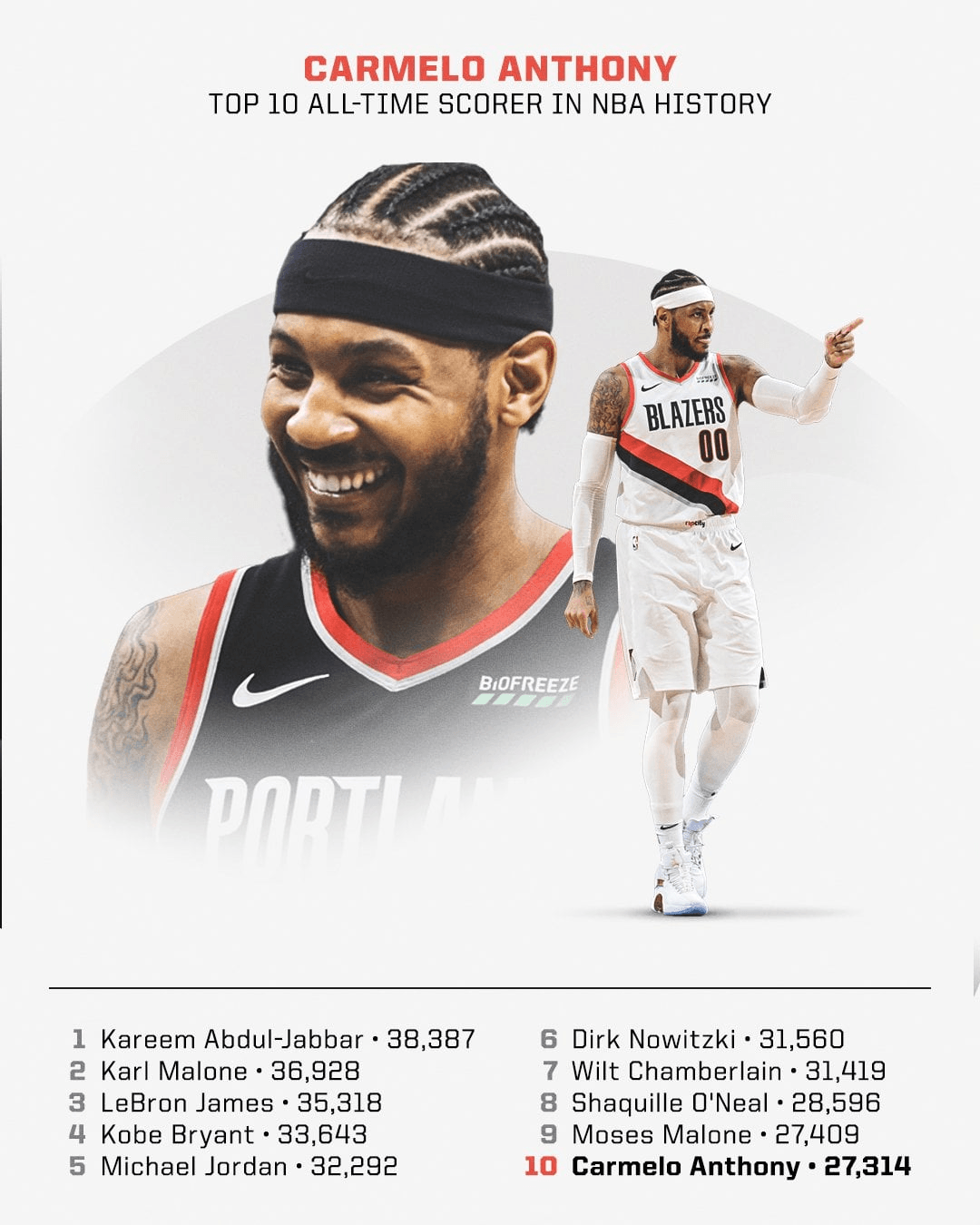 Após sair dos Knicks andou desaparecido e muitos consideraram que seria um fim de carreira prematuro para Melo, mas esta mudança para os Blazers veio mostrar que ele ainda tinha mais alguma coisa para acrescentar. Não sendo uma das estrelas da equipa, é um shooter incrível e com a sua experiência acaba por ser uma peça importante numa óptima equipa.