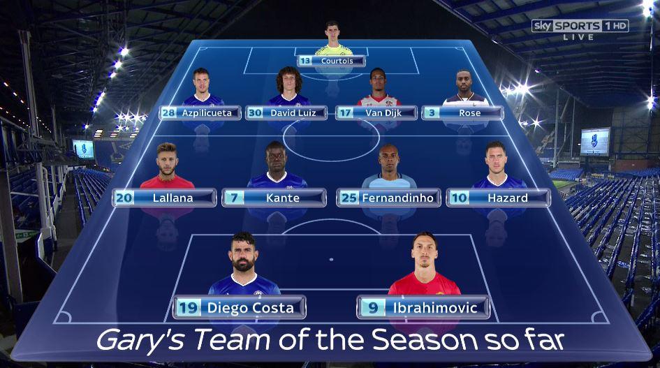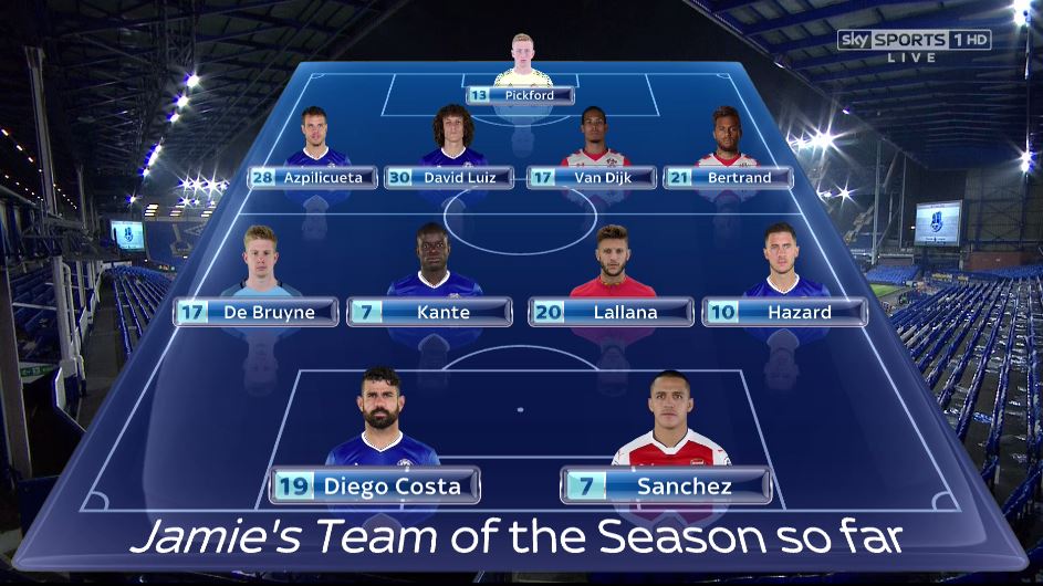 Jamie Carragher e Gary Neville, conhecidos comentadores da Sky Sports, nomearam hoje aquela que consideram ser a equipa da época da Premier League até ao momento. O Chelsea é, como seria de prever, o clube mais representado. Os blues contam com 5 dos 7 elementos a integrar ambos os onzes (Azpilicueta, David Luiz, Kanté, Hazard e Diego Costa), enquanto que van Dijk – que em Janeiro vai ser fortemente cobiçado – e Lallana completam os restantes elementos.