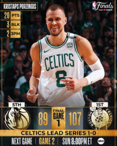 Os Celtics bateram os Mavs, por 107-89, no jogo 1 das finais. Boston no final do 1.º período já vencia por 17 e ao intervalo por mais de 20. Porzingis foi decisivo ao somar 20 pontos vindo do banco. Brown chegou aos 22. Tatum 16 a 11 ressaltos. Já na equipa de Dallas, Doncic conseguiu 30 pontos mas apenas uma assistência, já Irving não passou dos 12.