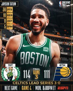 Os Celtics fizeram o 3-0 na final do Este ao vencerem em Indiana, por 114-111. Os Pacers não tiveram o lesionado Tyrese Haliburton mas chegaram a ter 18 pontos de vantagem e entraram nos últimos 3 minutos a vencer por 8, no entanto vacilaram, com Holiday a ser decisivo nessa fase. Tatum apontou 36 pontos. Já os 32 de Nembhard não chegaram à equipa da casa.