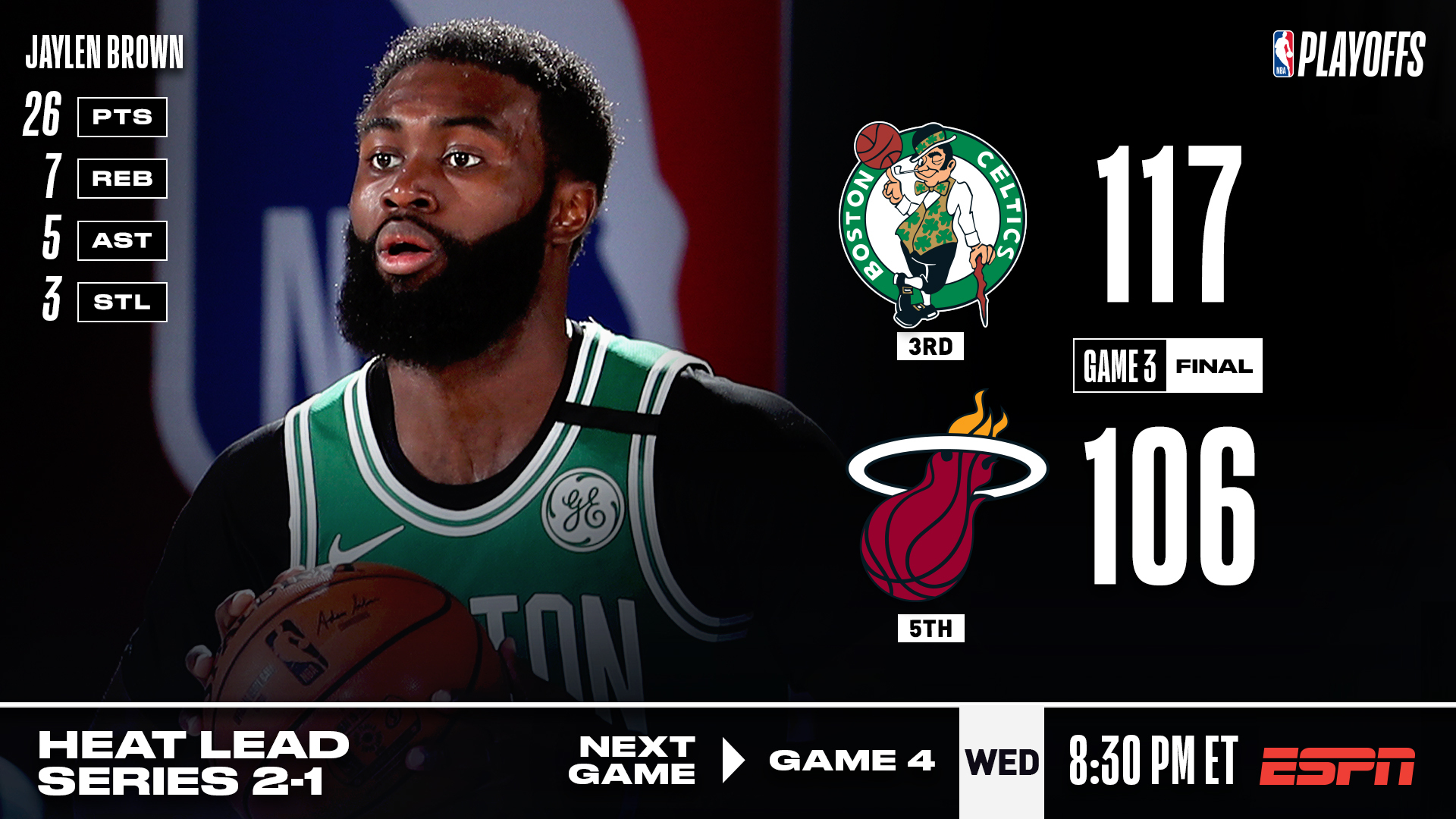 Jogo com menos história do que os 2 anteriores, uma vez que os Celtics lideraram do primeiro ao último minuto, sem ter havido qualquer mudança na liderança do marcador. O quarteto-fantástico de Brad Stevens esteve em grande destaque, combinado para 92 pontos. Também Hayward, de regresso, deu outra tranquilidade às posses que lhe chegaram e contribuiu na defesa. Já nos Heat, Dragic esteve em dia não.