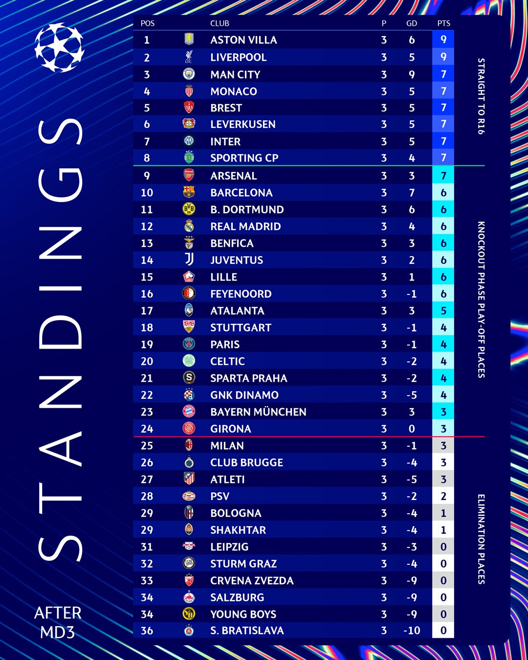 O Sporting subiu ao 8.º lugar da Liga dos Campeões, o último que dá apuramento direto. Os leões têm os mesmos 7 pontos de City, Mónaco, Brest, Leverkusen, Inter e Arsenal. A tabela é liderada pelo Aston Villa, que soma 9 pontos, os mesmos do Liverpool. Já o Benfica é 13.º. Destaque ainda para o Milan, Atlético Madrid e RB Leipzig que estão fora do Top 24.