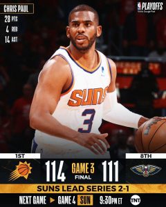 Os Suns, mesmo sem o lesionado Booker, fizeram o 2-1 na série contra os Pelicans ao vencerem em New Orleans por 114-111. A partida foi equilibrada mas Chris Paul desequilibrou a balança no último período, tendo apontado 19 dos seus 28 pontos nessa fase. O base, que também somou 14 assistências, conseguiu ainda a proeza de não ter somado qualquer turnover nos últimos 2 jogos. Também Ayton brilhou com 28 pontos e 17 ressaltos, de pouco valendo aos Pelicans os 34 pontos de Ingram e 30 de CJ McCollum. Nos outros jogos da noite, os Bucks foram a Chicago esmagar por 111-81. Nunca os Bulls tinham perdido por 30 em casa num jogo dos playoffs. Já os Hawks bateram os Heat, por 111-110. Miami chegou a ter uma run de 21-0 e uma margem que parecia confortável, mas Atlanta recuperou à base dos triplos, tendo Trae Young (24 pontos) decidido o encontro a menos de 5 segundos do fim.