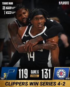 Os Clippers apuraram-se pela 1.ª vez na história para a final da Conferência Oeste ao baterem os Jazz, no jogo 6, por 131-119. A turma de LA chegou a estar a perder por 25 pontos no arranque do 3.º período, mas realizou uma 2.ª parte de sonho (81 pontos) e marcou duelo com os Suns. O jovem Terance Mann foi decisivo, ao marcar 39 pontos, 20 deles no 3.º período. Paul George (28), Reggie Jackson (27) e Patrick Beverley (12) também fizeram a diferença nos minutos finais, de nada valendo a Utah os 39 pontos de Mitchell. No outro jogo da noite os 76ers foram a Atlanta vencer por 104-99 e forçaram o jogo 7. Curry e Harris marcaram ambos 24 pontos, Embiid chegou aos 20, enquanto  Trae Young apontou 34 por Atlanta.