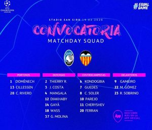 Thierry Correia e Gonçalo Guedes integram a convocatória do Valencia para o duelo em Milão, frente à Atalanta, a contar para os oitavos da Champions. O lateral não é utilizado desde a última eliminatória da Taça do Rei, em Janeiro, ao passo que Guedes foi titular pela primeira vez em 2020 no confronto com o Atletico Madrid, após mais de quatro meses de paragem. Também Cillessen foi chamado, ao contrário dos lesionados Rodrigo, Gabriel Paulista, Coquelin, Florenzi, Piccini, Kang-in Lee e Garay.