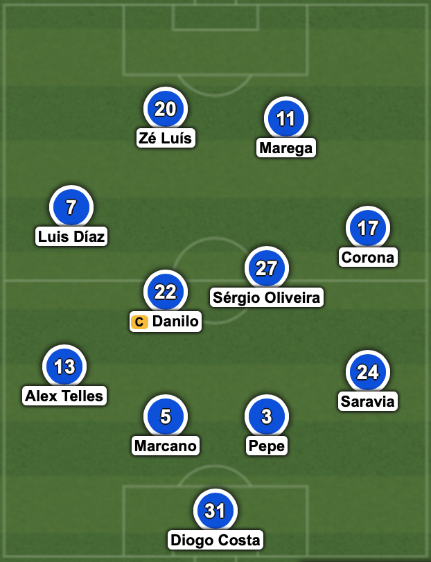 De resto, em termos de XI base falta, pelo menos, um GR e um médio que entrem no XI para os lugares de Diogo Costa e Sérgio Oliveira. Depois no ataque dependerá da saída de Marega, caso contrário penso que o maliano continuará no XI mas diria que o Aboubakar, estando a 100% partirá na frente de Zé Luís.