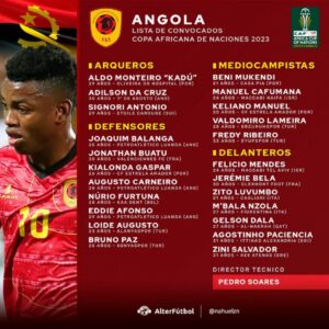 Angola divulgou a sua lista de convocados para a CAN, na qual estão presentes os jogadores do Estrela da Amadora Kialonda Gaspar e Keliano Manuel, o jogador do Casa Pia Beni Mukendi e o guardião do Oliveira do Hospital Kadú. Os ex-Sporting Bruno Paz e Gelson Dala também forma convocados, bem como Fredy, que passou pelo Belenenses.